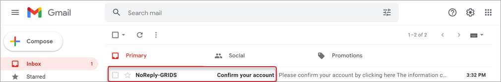 After you click the Register button to create a new account, you’ll see a message that your GRIDS search account has been created. Follow the instructions to “Please check your email to confirm and complete registration.”