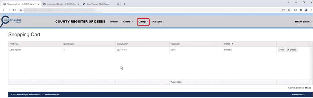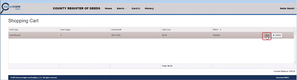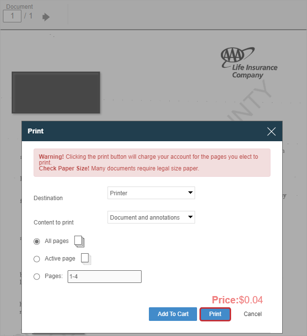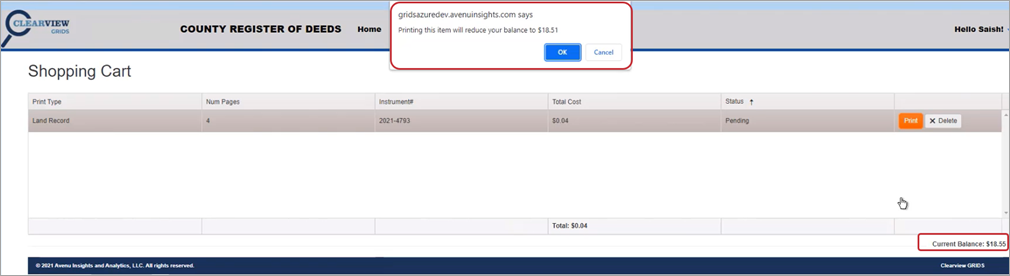 A message shows you what your new balance will be after printing this document if there is a fee for printing copies.