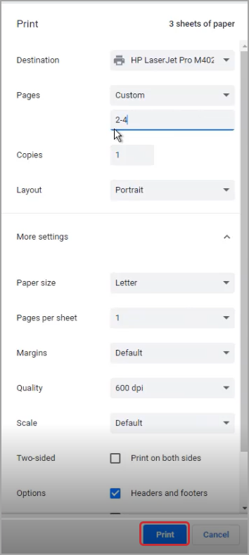 Click Print to print all pages with the current settings or click More settings to see more settings options and then click Print.