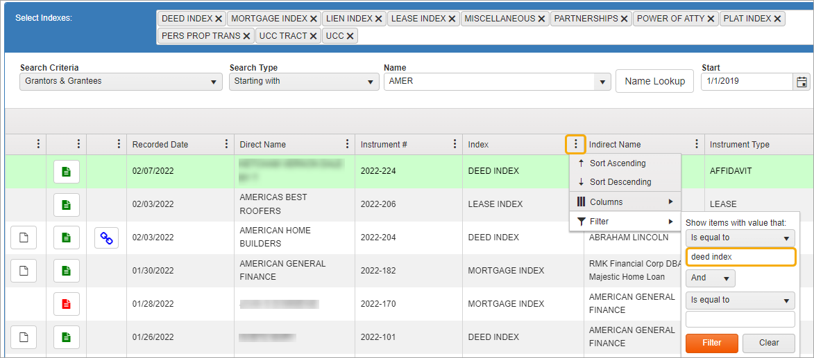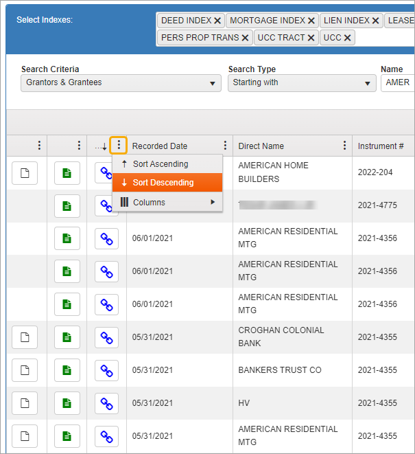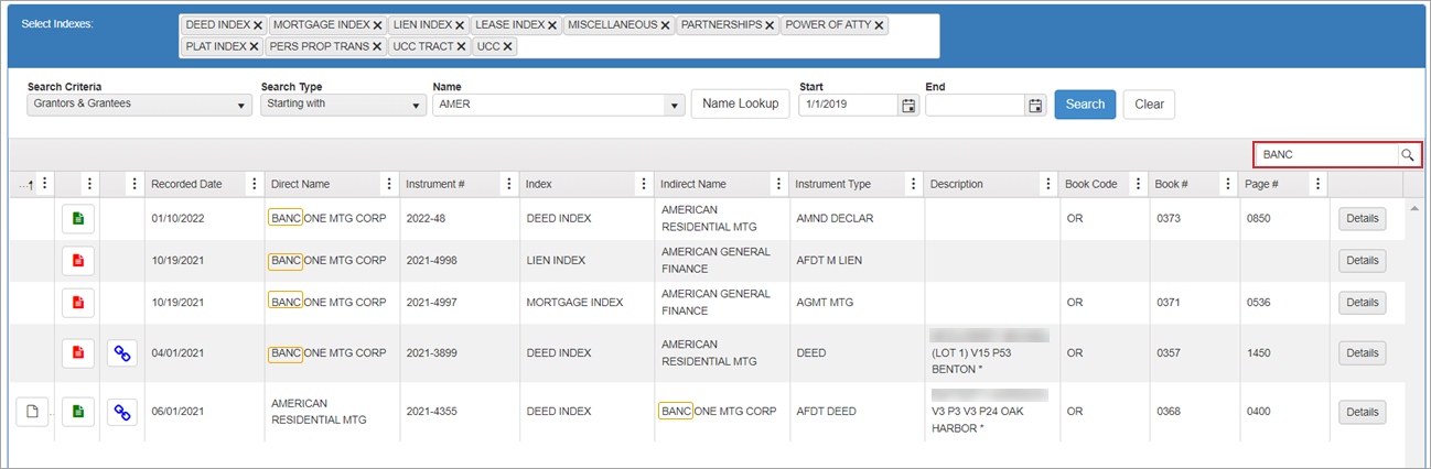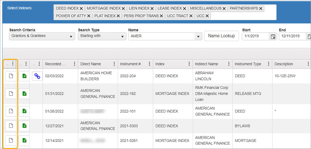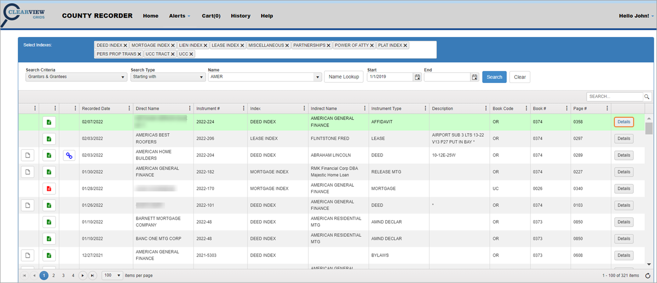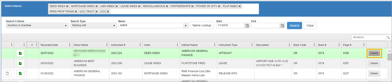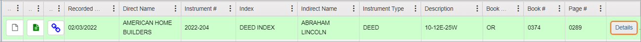 NOTE: Green rows indicate documents you have already viewed. When conducting a name search, it may bring up more than one row with the same instrument number. If you view details on one instrument number, all instances of that document will be highlighted in green so you will know you have looked at them all.