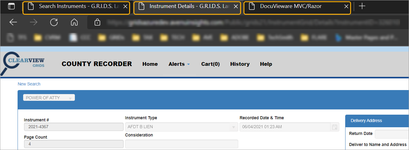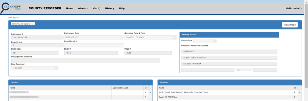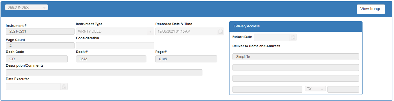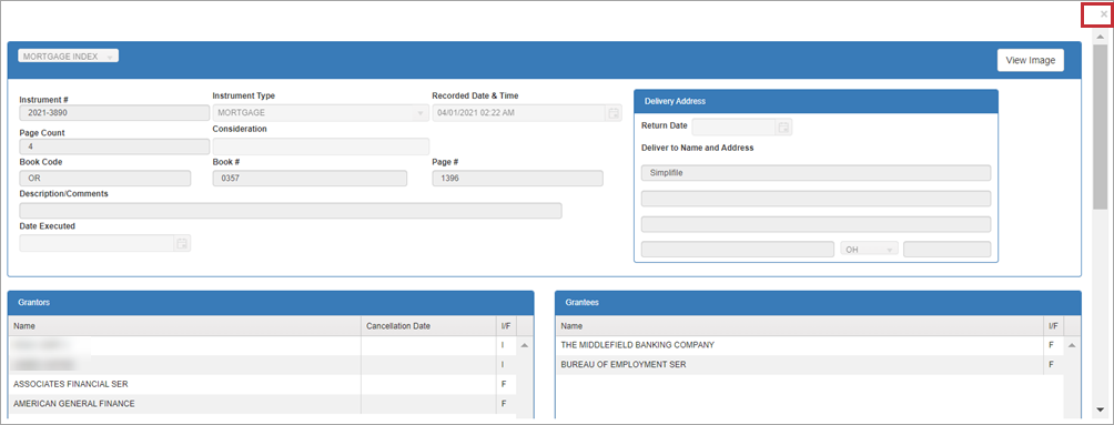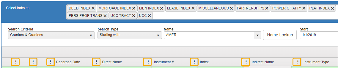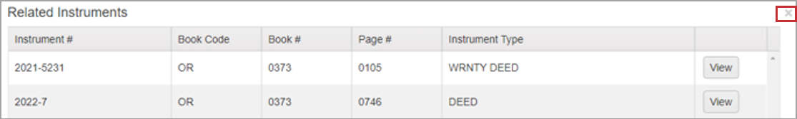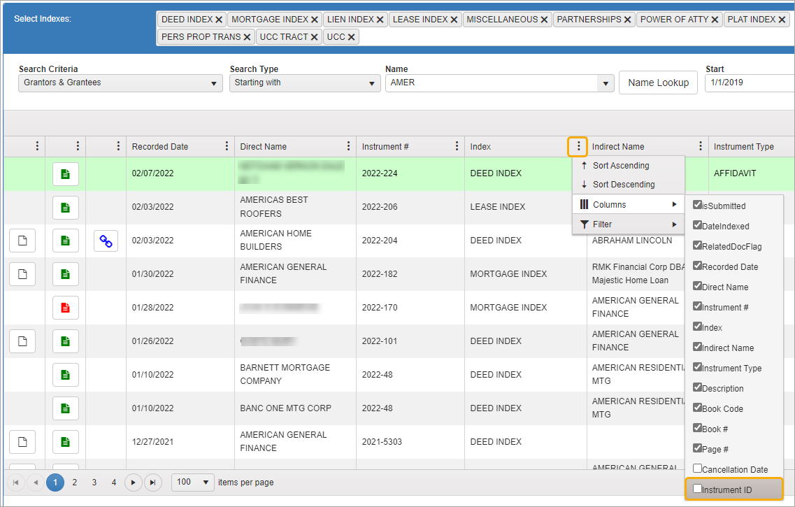 NOTE: Green rows indicate documents you have already viewed. When conducting a name search, it may bring up more than one row with the same instrument number. If you view details on one instrument number, all instances of that document will be highlighted in green so you will know you have looked at them all.