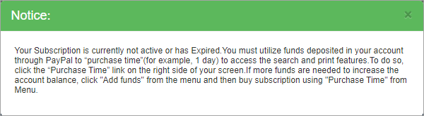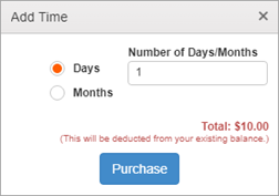 If the account has expired, or no time has been purchased, a message will ask you to Purchase Time (in days or months) using funds that have already been deposited via PayPal.