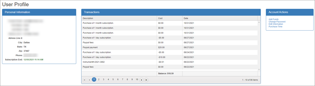 You can add funds or purchase time from the User Profile page using the options under Account Actions.