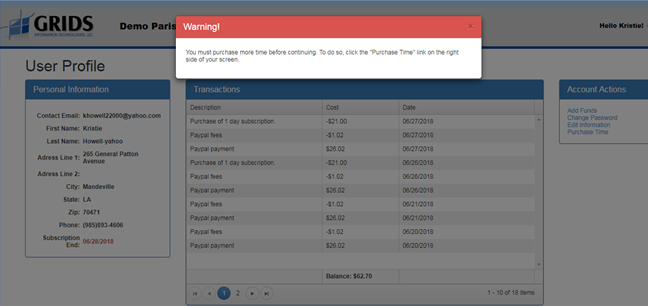 If your GRIDS account balance is too low, you will need to use your PayPal account to add funds to be able to continue using GRIDS Public Search in counties with fee-based search.